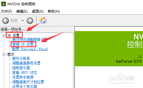 在NVIDIA节制面板里,我们选择点【3D 设置——办理 3D 设置】,如图。