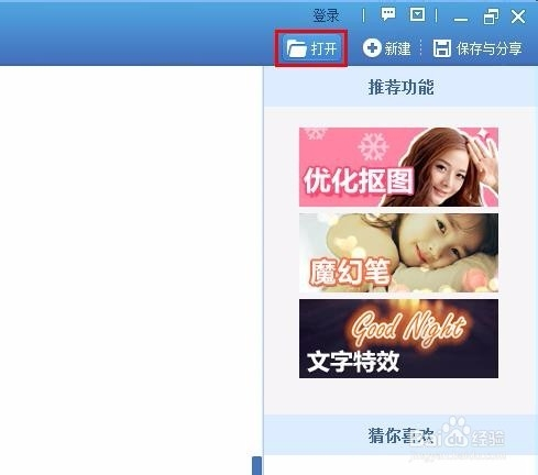 第一步:在美图秀秀软件中,单击右上角“打开”。