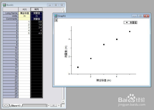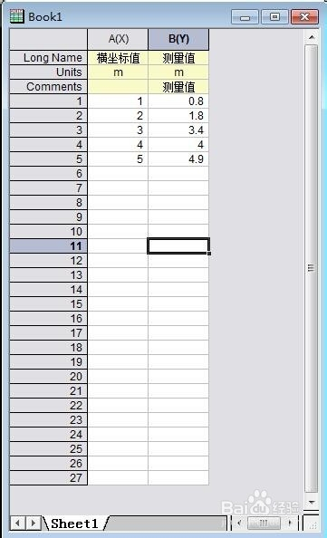 将数据输入或导入到表格中,为了便利看出数据类别,进行了文字标注。这里需要拟合的就是测量值了。