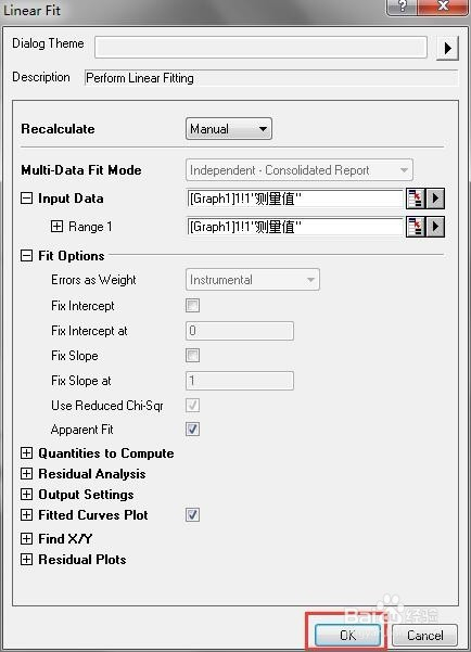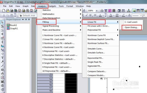 接下来就是拟合数据了,依次点击【Analysis】-【Fitting】-【Linear Fit】-【Open Dialog】,会主动弹出对话框。