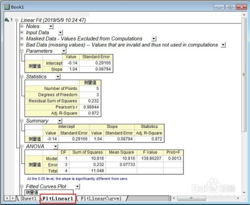 若是想要更为具体的拟合数据,可以在原数据表格中点击【FitLinear】。