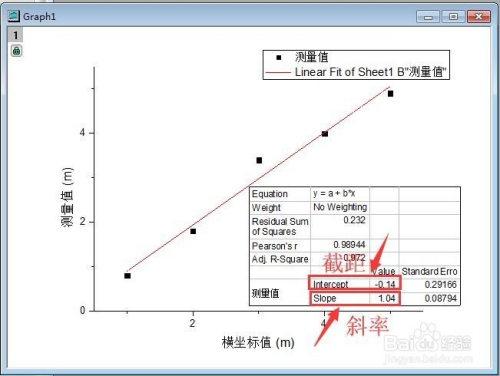 回到数据图中,这样就可以拟合数据了,表格里面给出了线性拟合方程的具体信息。