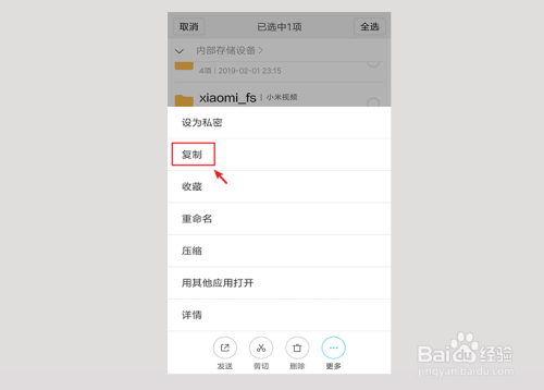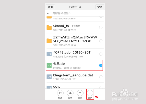 同理,也可以把我们手机上的文件复制或者剪切到U盘,好比:选中文件“名单”,点击【更多】
