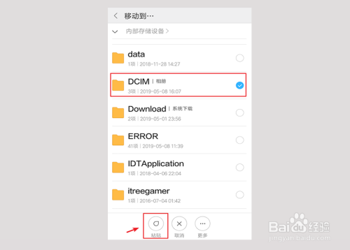 进入手机存储页面,选择一个文件夹,好比:相册,点击【粘贴】。