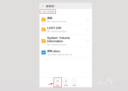 进入USB存储器页面,点击【粘贴】。