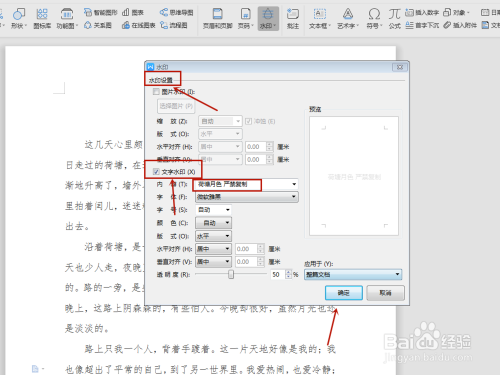 我们选中文字水印前的复选框,在内容后边输入“荷塘月色 严禁复制”,点击确定。