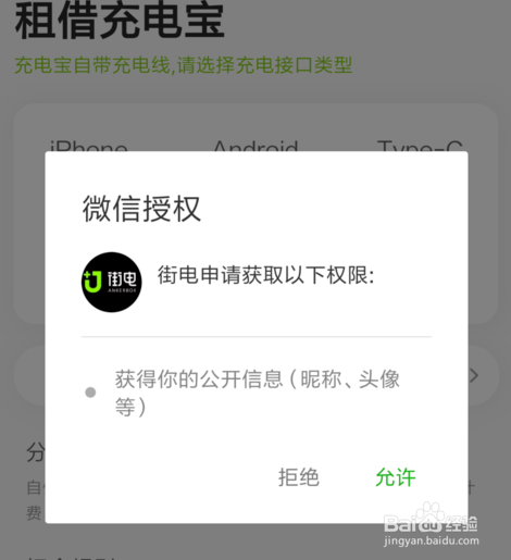 2、我们用微信点击扫一扫后,识别左上角的二维码后呈现街电的微信授权,点击许可,如图所示。