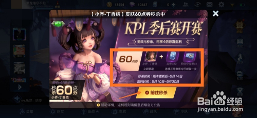 首先打开手机上的“王者荣耀”,登录游戏,进入游戏界面后,系统会主动弹出“小乔丁喷鼻结皮肤秒杀”窗口,点击箭头处“前去秒杀”即可。