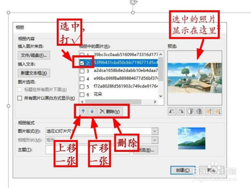 然后弹出【相册】对话框,在这里可以对照片进行编纂:选中照片(在小方框里打√),该照片的预览就显示在右边。在此状况下可以: