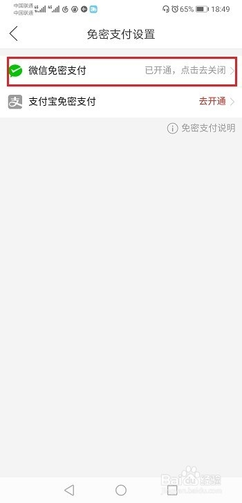 第四步进去免密支付设置界面,点击微信免密支付,如下图所示: