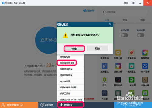 重启资本办理器:打开软媒魔方程序 - 快捷指令 - 重启文件办理器 - 确定;