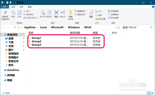 在C:\Users\abc987699\AppData\Local\Microsoft\Windows\WinX 路径中的WinX文件夹中有:Group1/2/3的子文件夹: