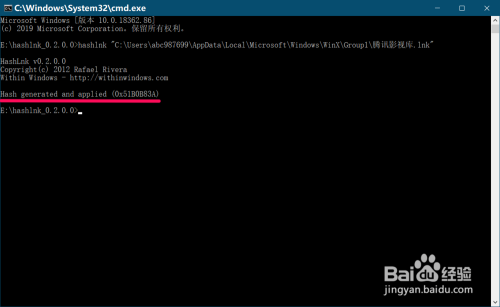在 C:\Windows\System32\cmd.exe 号令提醒符窗口中,手动输入:hashlnk - 空格 - 按下键盘上的 Ctrl+V 键,此时号令提醒符窗口中会显示输入的为: