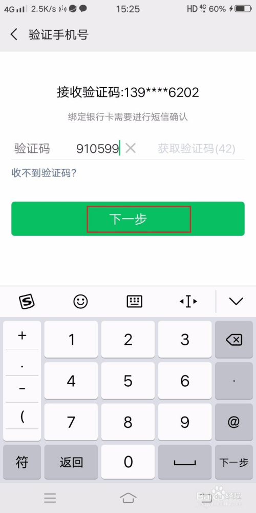 如图,在本页面中心输入这张银行卡在银行打点时预留的手机号码,然后点击下一步。