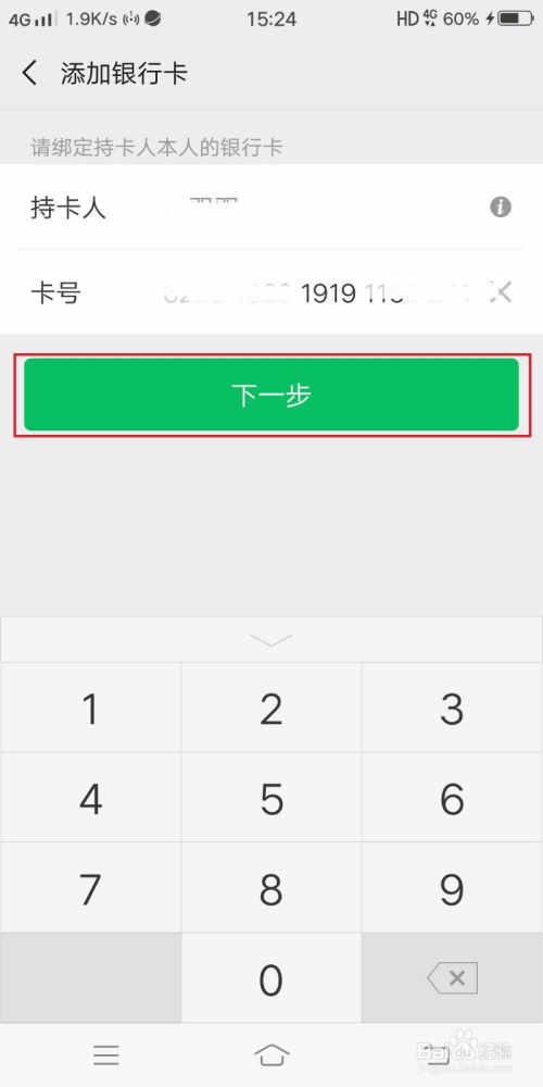 如图,在本页面的上方输入本身的银行卡号,然后点击下一步。