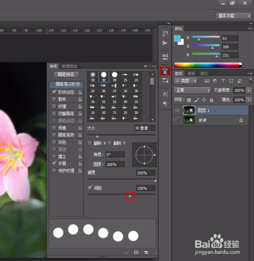 第四步:单击红色线框标识表记标帜的按钮,将画笔间距设置较大一些。