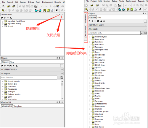 若是不想看到这么多的框,只想专注于数据库的相关信息,就可以将其他框封闭或者埋没,这两种体例只是点击分歧的按钮罢了,具体拜见截图