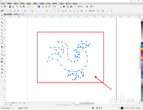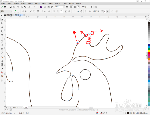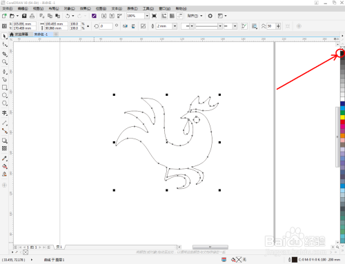 选中多边图案,点击【外形东西】,选中图案上的所有点,点击【转换为曲线】将图案转曲后,按图示调整节制点,完当作整个生肖鸡轮廓图案的绘制(如图所示);