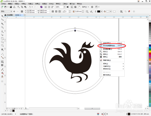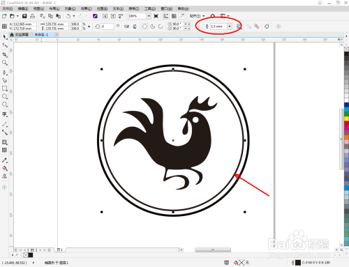 点击【卵形东西】,在作图区域绘制一个圆框。点击【轮廓图】对圆形图案进行轮廓后,点击鼠标右键-【拆分轮廓图群组】,将两个图案拆分并别离设置好圆框的轮廓宽度。这样我们整个生肖鸡图标便全数建造完当作。