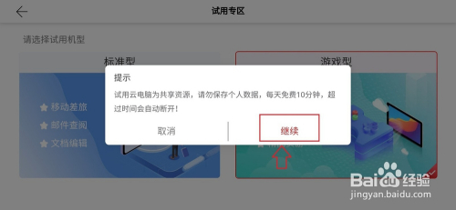 接着在试用提醒中点击“继续”。(若是是利用流量的话,还会有流量提醒。依旧点击“继续”即可。)