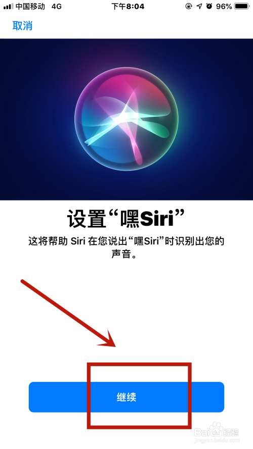 系统就会提醒是否继续设置Siri识别您的声音,点击【继续】