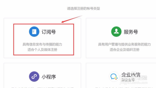 在跳转的界面下面有四个账户类型,一般我们小我注册的公家号都是选择第一个订阅号,点击订阅号进入;