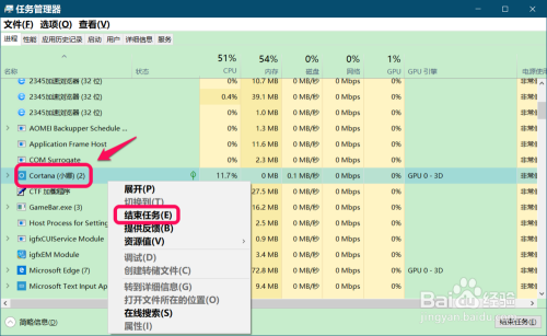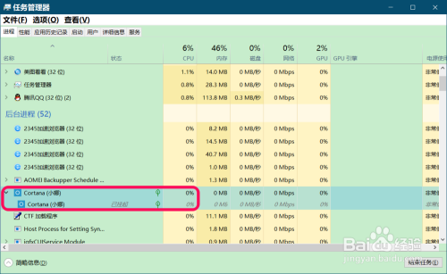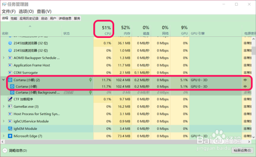 打开使命办理器,并点击打开使命栏中的 Cotana,在使命办理器中可以看到: