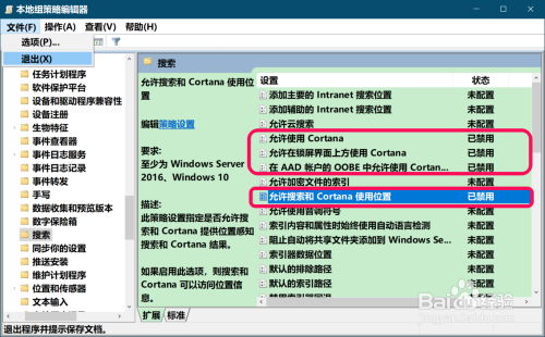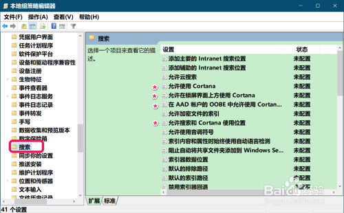 在 Windows 组件的睁开项中找到并点击【搜刮】,在搜刮对应右侧窗口中我们可以看到,关于Cotana(小娜)的有: