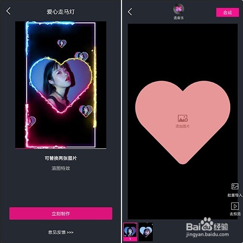除了特效视频,你也可以利用 音乐相册专区 的功能,建造视频相册,纪念两小我之间的点点滴滴。专区内,按照清楚度需求,选择合适的进口,起头建造。