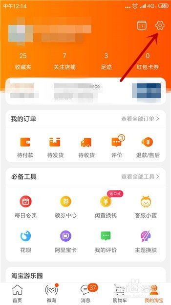 打开了淘宝的小我本家儿页后点击打开右上角的【设置】。