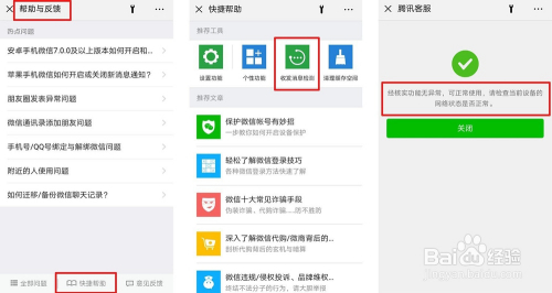 接着可以微信“设置”点击“帮忙与反馈”,选择“快捷帮忙”,在选择“收发动静检测”可以查看收集是否正常.