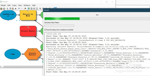 最后一步,点击运行东西,模子迭代器就起头运行了。运行竣事后,颠末投影转换和裁剪的数据就存储到了t2文件夹内