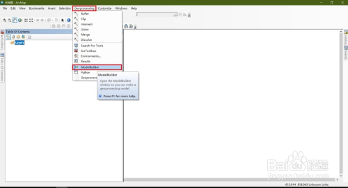 首先,打开ArcMap,我们依次点击Geoprocessing、Modelbuilder,进入模子界面