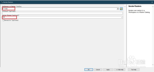 双击栅格迭代器,按照提醒,在第一个红框内添加存储待处置栅格数据的文件夹,第二个红框内选摘要处置的数据的类型