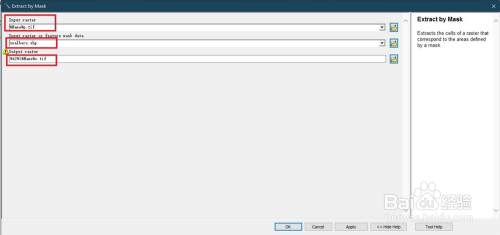 双击按掩膜提取东西,按照提醒,在第一个红框内填入上一步调的输出文件即%Name%p.tif,第二个红框内添加掩膜文件,第三个红框内填入存储位置%t2%\%Name%c.tif