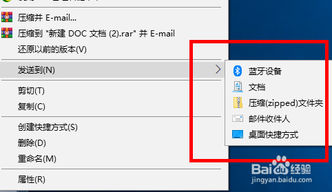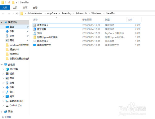 Windows 10 系统默认的 发送到 功能里有:传真收件人、蓝牙设备、文档、压缩文件、邮件收件人、桌面快捷体例 这几个项目。