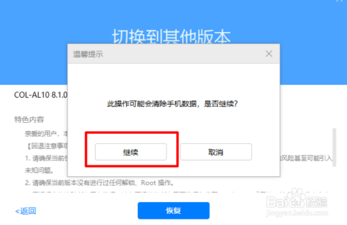 点击后页面会弹出提醒,会告诉我们可能会断根手机的数据,点击继续。
