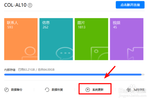 将手机与电脑进行毗连后,可以读取手机中的资料信息,这是申明毗连当作功,点击本家儿界面的系统更新的选项。
