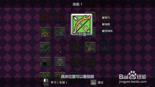 弓箭要解锁首先需要的是解锁技术打猎,这样就有了制造弓和箭的资格,打猎是在农业技术的左边,具体位置可以看视频和下图