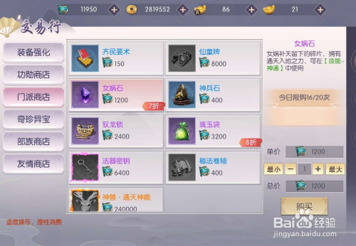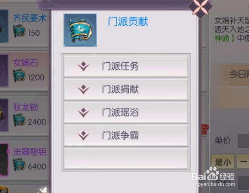 门派商铺中,需要利用门派进献点来进行采办女娲石。