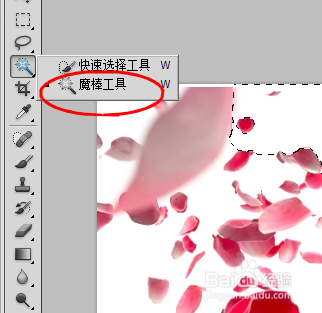 我们可以看到已经选择了白色部门,四周都是蚂蚁线,这时辰我们点击键盘上的del键,图片的白色部门立即酿成透明色,这样我们就完当作了抠图,我们可以把花瓣完全抠掏出来,
