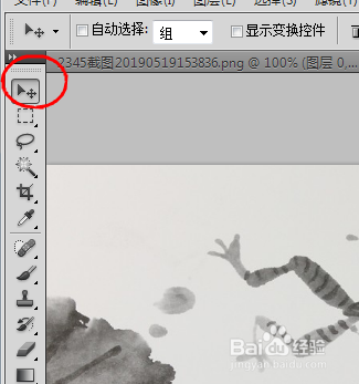 然后点击左侧的移动东西,把花瓣素材移动到水墨图片上面,按CTRL键+t键,画面4周呈现了方框我们可以拉动使花瓣笼盖整个水墨图片,按回车键确认,