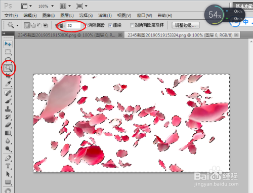 选择左侧菜单的魔棒东西,设置容差为32,点用鼠标点击图片中白色部门