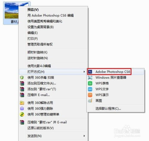 第一步:选中需要边缘虚化的图片,单击鼠标右键,打开体例中选择ps。