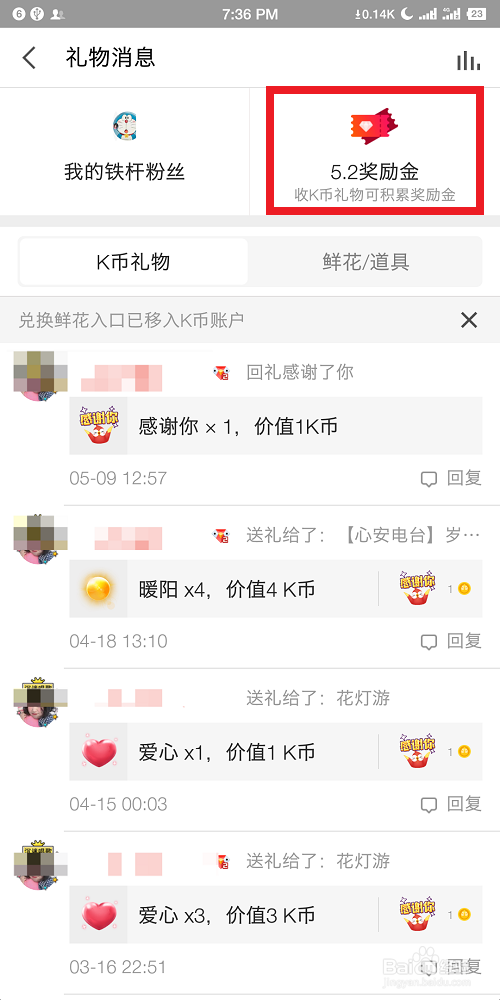 然后,我们就会进入到下图的这个界面中。我们可以在这里查看到本身所发布的作品所获得的所有的k币,礼品,以及所获得的鲜花道具。