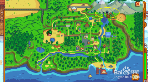 星露谷里的矿洞位于湖泊上方,冒险者协会左侧,如下图。