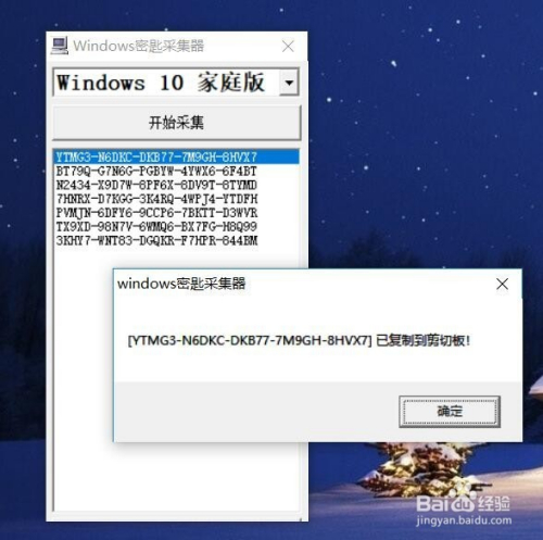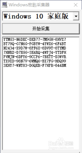打开windows密匙采集器,点击软件的蓝色区域,我的电脑是家庭版的,我就选择家庭版,你的电脑是什么版本,就选什么版本,选好后,点击起头采集,然后期待一会,就会看到采集到的密匙信息了
