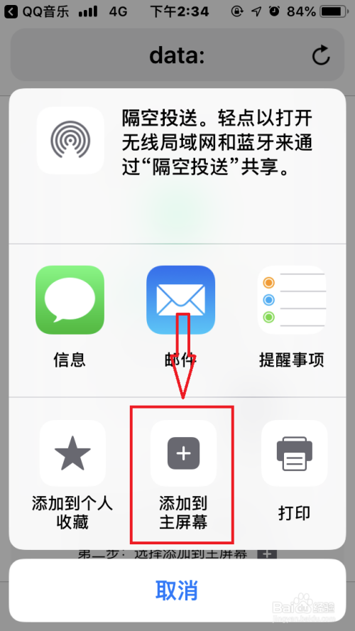 点击“添加听歌识曲到桌面”——“分享图标”——“添加到本家儿屏幕”——“添加”,即可添加“听歌识曲”到桌面。