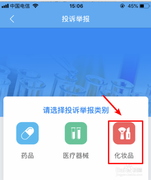 点击后在投诉举报类别中,选择化妆品的图标,进入到投诉界面。