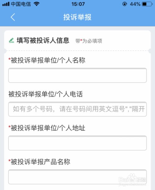点击后,填写被投诉人的信息,好比举报的单元、地址、产物等,填写完毕后点击下一步。